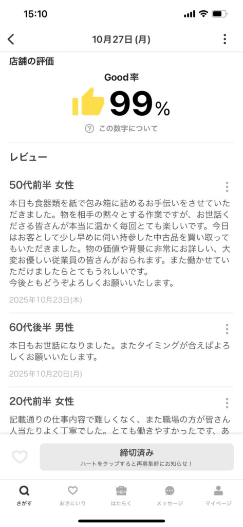 単発アルバイトの方からも嬉しいお声を頂けております。 10月 26, 2025 | 求人, 買取, おかたづけ ———————————————————————————————————— なんか、手前味噌な情報ばっかりですいませんw 株式会社ユリイカには 正社員の方、 アルバイトの方、 業務委託の方など 色んな方がおられます。(少人数ですけどw) スキマバイトのアプリ経由で働きに来られる方は2年前くらいから増えてきましたが リピーターの方も増えてきて嬉しい限りです。 スキマバイトは不定期の募集となりますが、 業界にご興味のある方は是非ご応募くださいませ。 コメントを送信 コメントをキャンセルメールアドレスが公開されることはありません。 ※ が付いている欄は必須項目ですコメント ※ 名前 ※ メール ※ サイト 次回のコメントで使用するためブラウザーに自分の名前、メールアドレス、サイトを保存する。 Δ